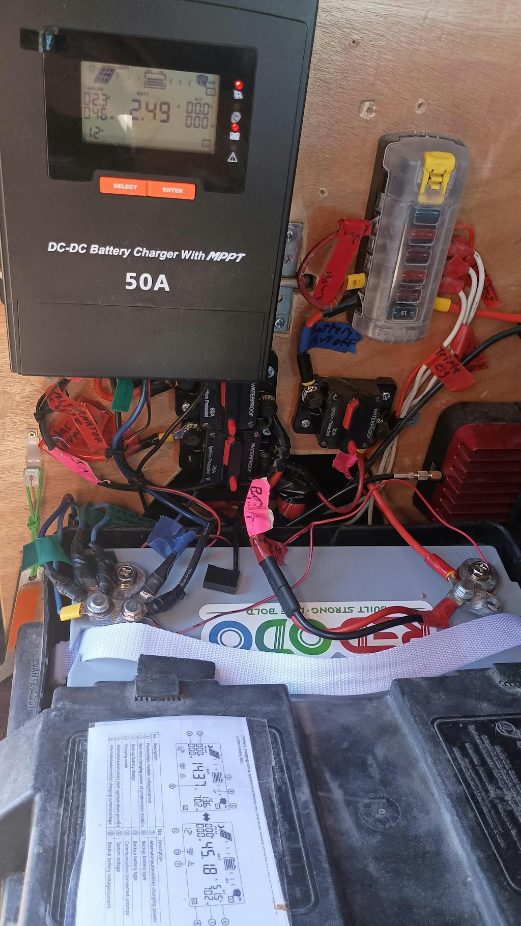 Over the last 12 years I have installed 5 different solar setups in 3 different vehicles. The Bravo 50A so far seems to be the complete ticket. The Bravo 50 is connected to a 100ah LiFePo battery with internal heating ability, 160W solar panel, and hooked up to the vehicle battery as well.
